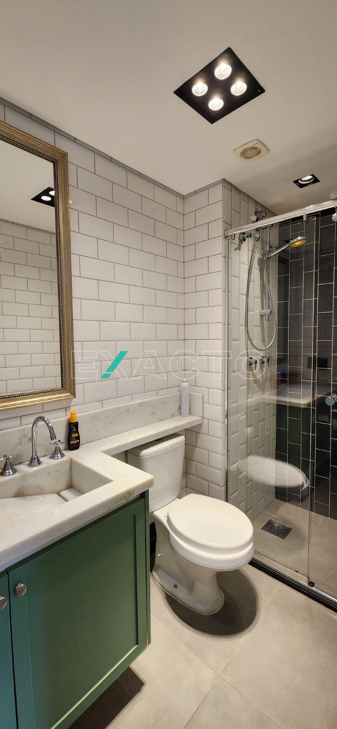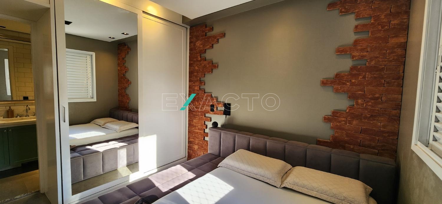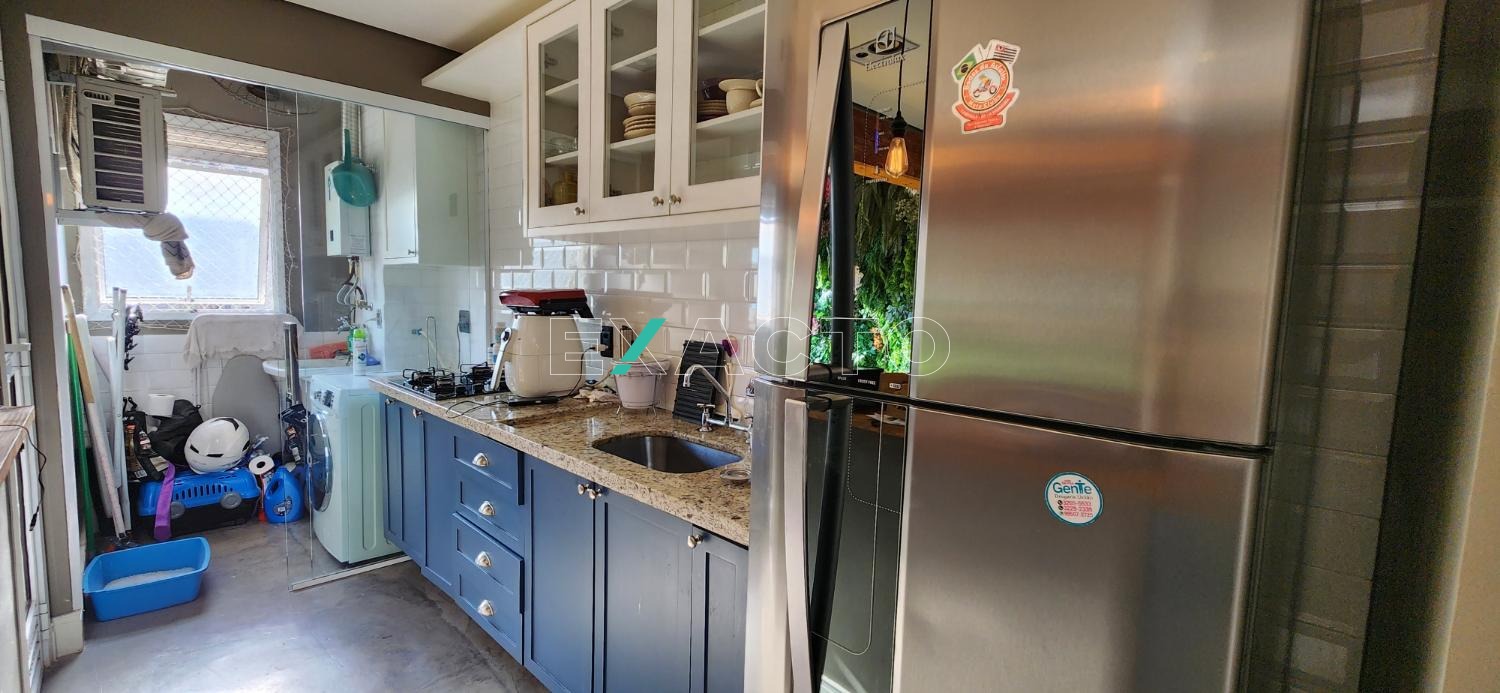 Sala 2 ambientes, integrada com a sacada envidraçada, cozinha planejada; área de serviço com armário; quarto (suíte) com armário planejado; banheiro com gabinete, boxe e espelho.