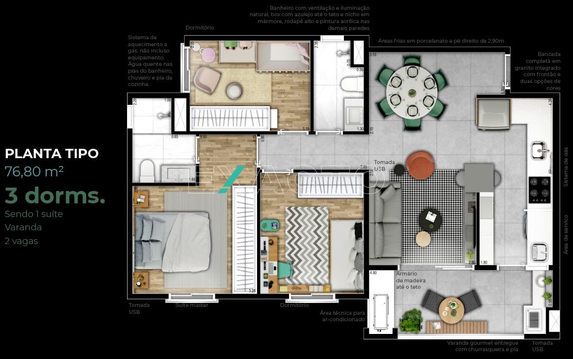 Apartamento rico em móveis planejados, sol da manhã, com 3 dormitórios sendo 1 suíte, 2 banheiros sendo 1 da suíte e ambientes integrados: sala de estar, jantar, cozinha e varanda, totalizando 77m² de muito conforto, modernidade e segurança em um dos condomínios mais cobiçados do Swiss Park!