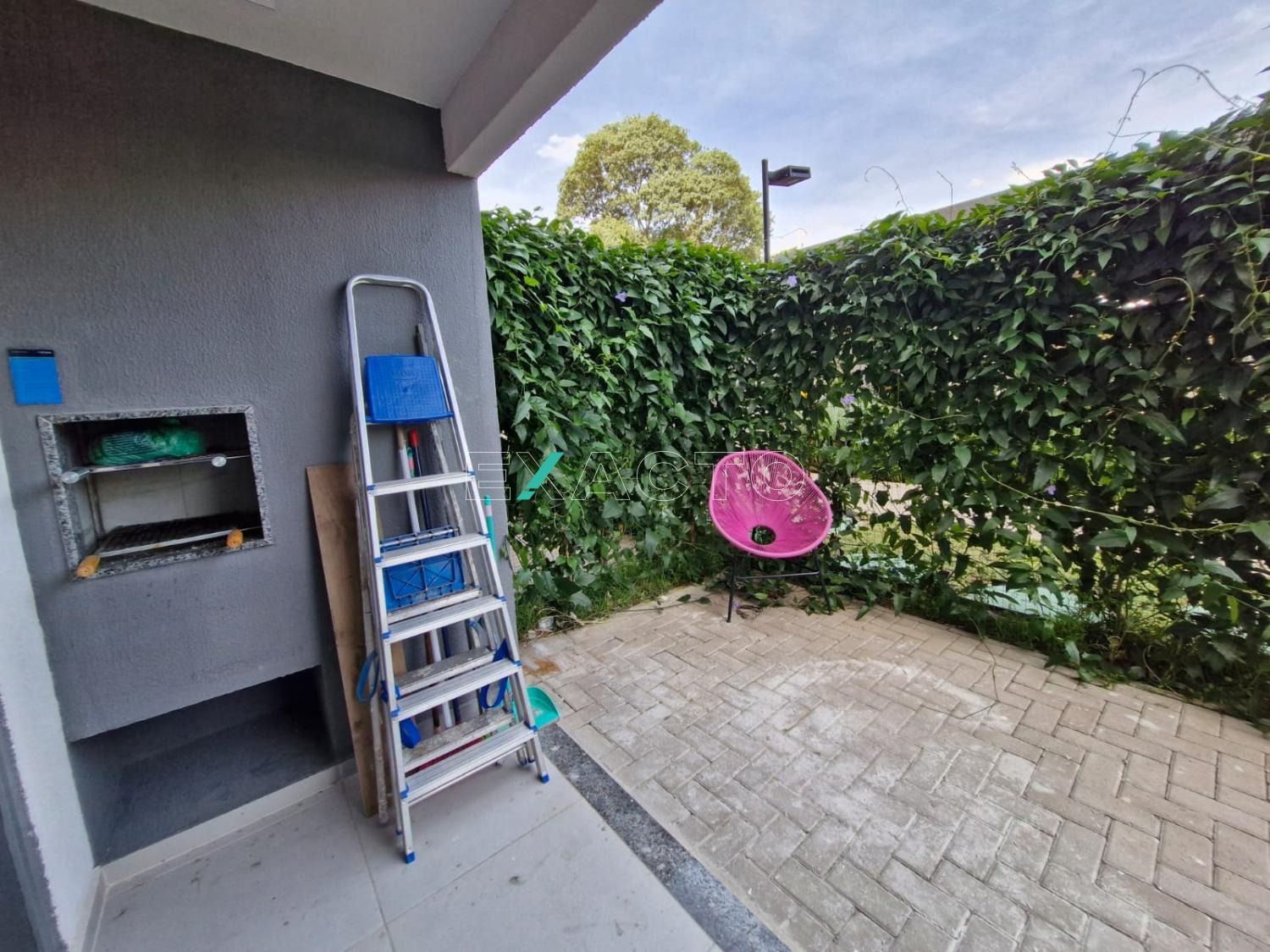 Sacada com churrasqueira a carvão. Além da porta da sacada tem uma porta direto da área de serviço para o quintal. Sol da manhã.