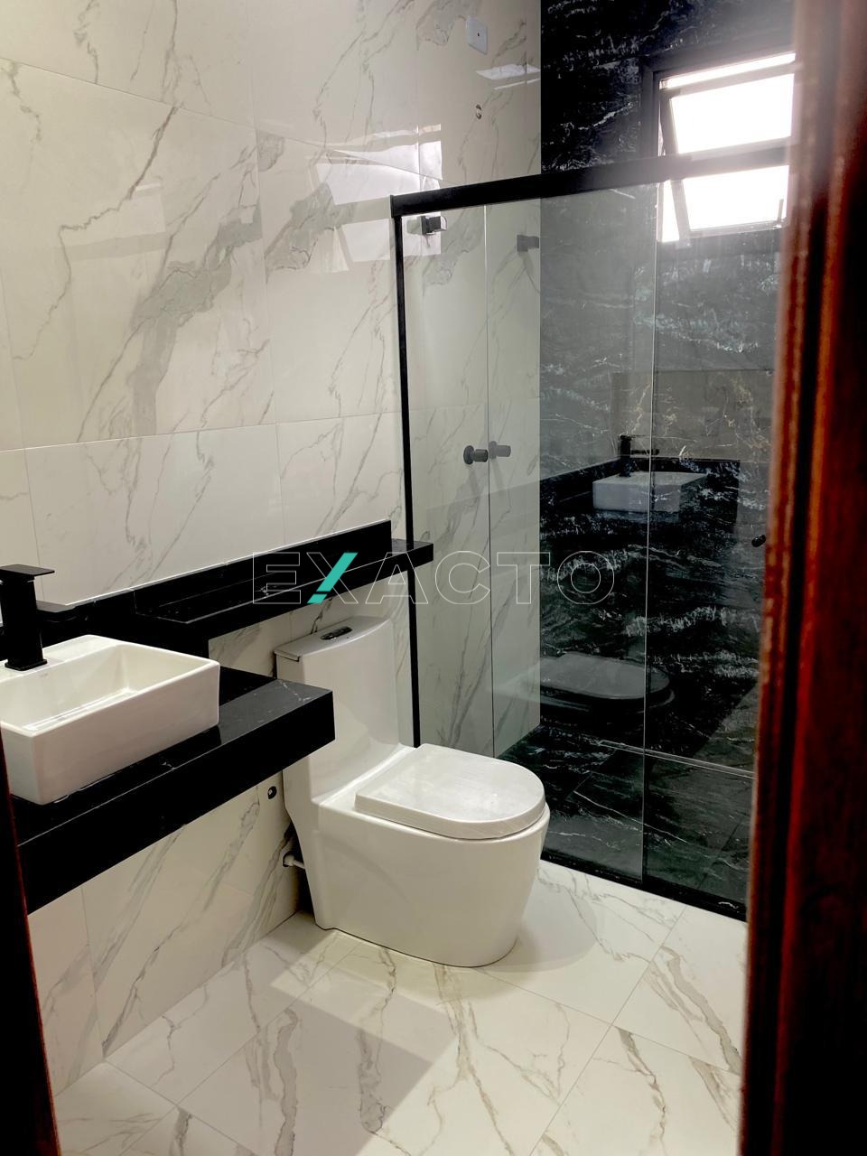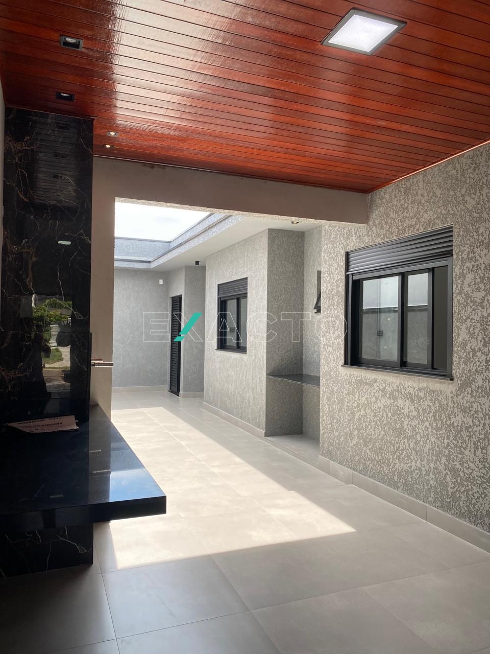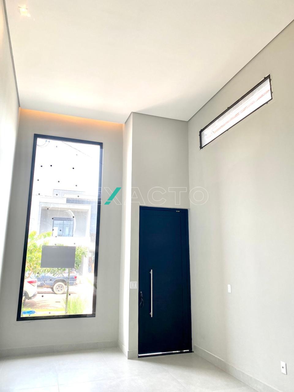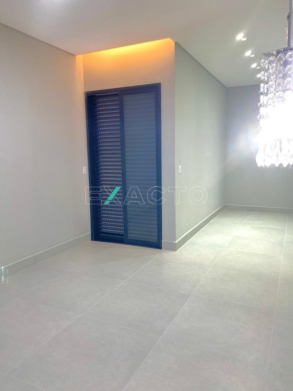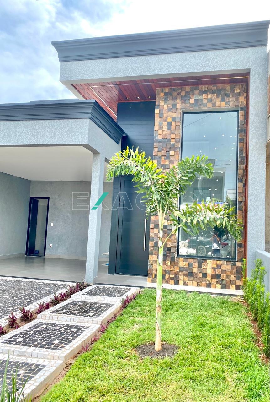 Casa térrea à venda, em condomínio, com sala para 2 ambientes, pé direito de 4,80m, 3 dormitórios, sendo 1 suíte com closet, cortineiros iluminados com LED, porta balcão, e 2 com cortineiro iluminado com LES, janelas automatizadas, banheiro social, cozinha com balcão e pia em mármore, escritório, área gourmet com churrasqueira, balcão, lavabo, lavanderia e vaga para 4 carros (2 cobertas). Conta ainda com pontos para ar condicionado, água quente, sistema boiller, esquadrias pretas, fachada rica em detalhes.