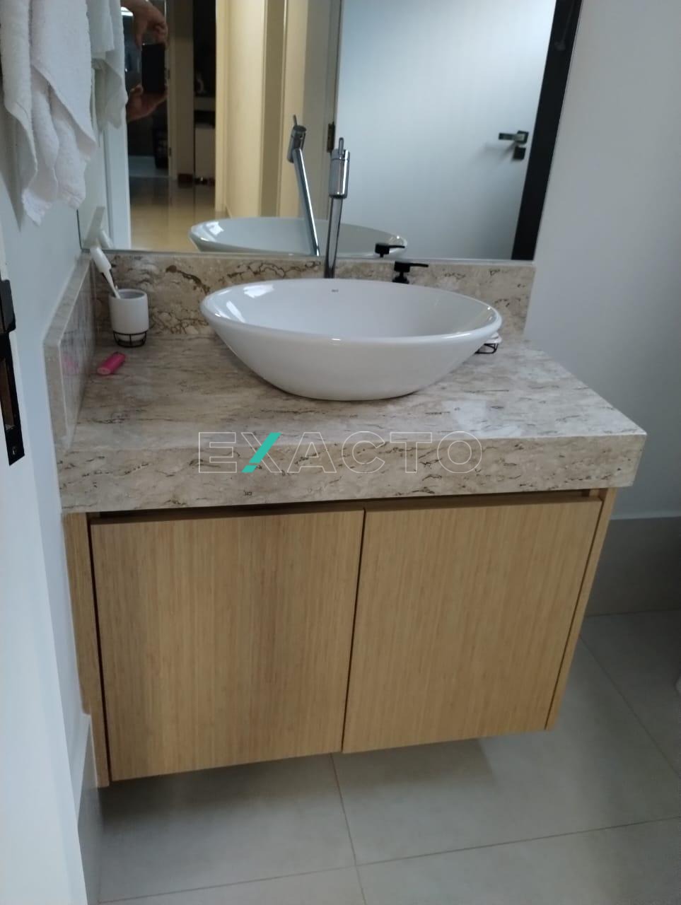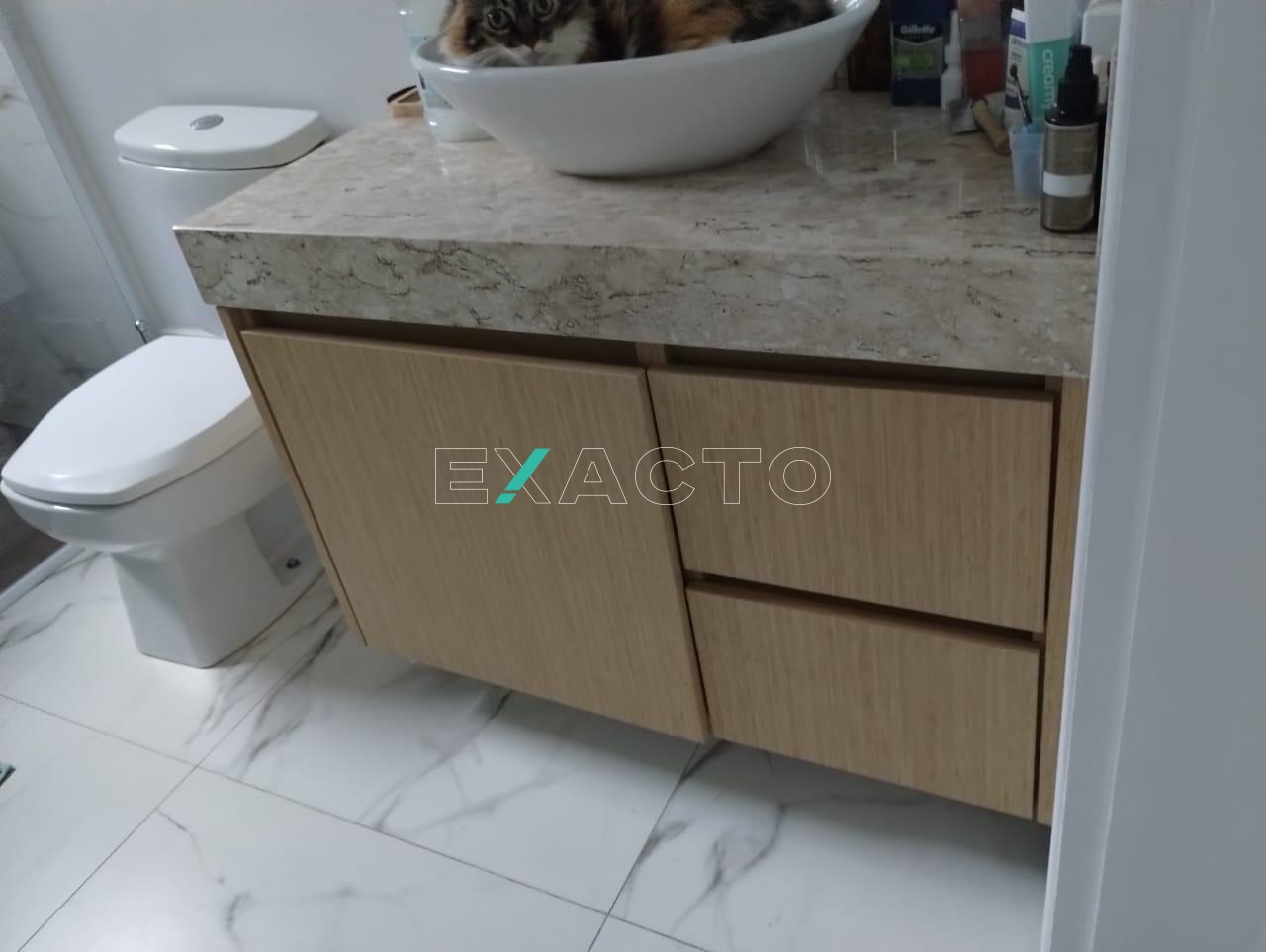 3 banheiros no total com armários, sendo 1 suíte, 1 social e 1 lavabo.