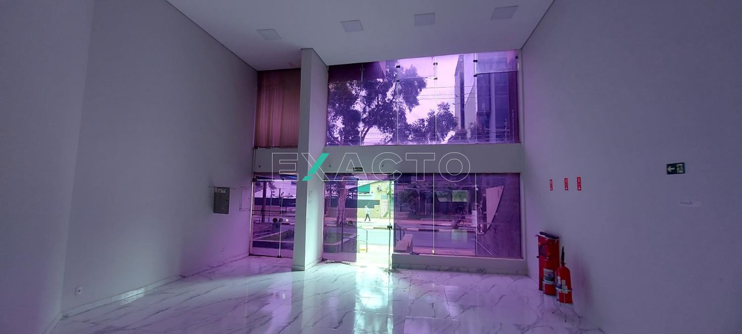 Pé direito duplo com fachada em Vidro temperado.