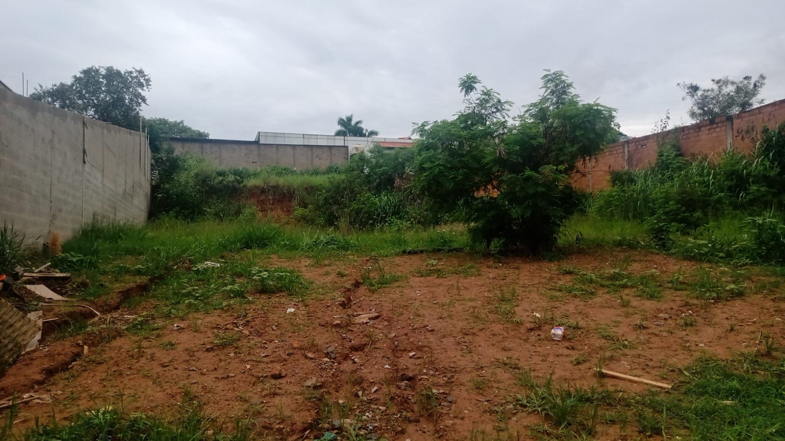 Terreno em rua já pavimentada, vizinho de alguns barracões recém contruídos.