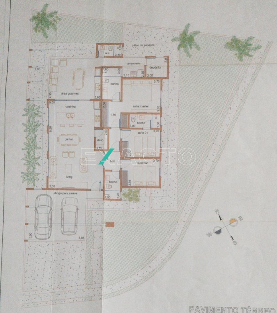 O projeto possui sala de estar, jantar e cozinha americana com pé direito duplo, 3 dormitórios, sendo 2 suítes (uma máster com closet) banheiro social , despensa, depósito e lavanderia .